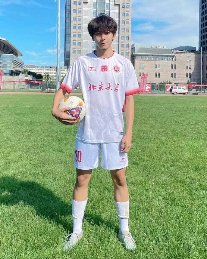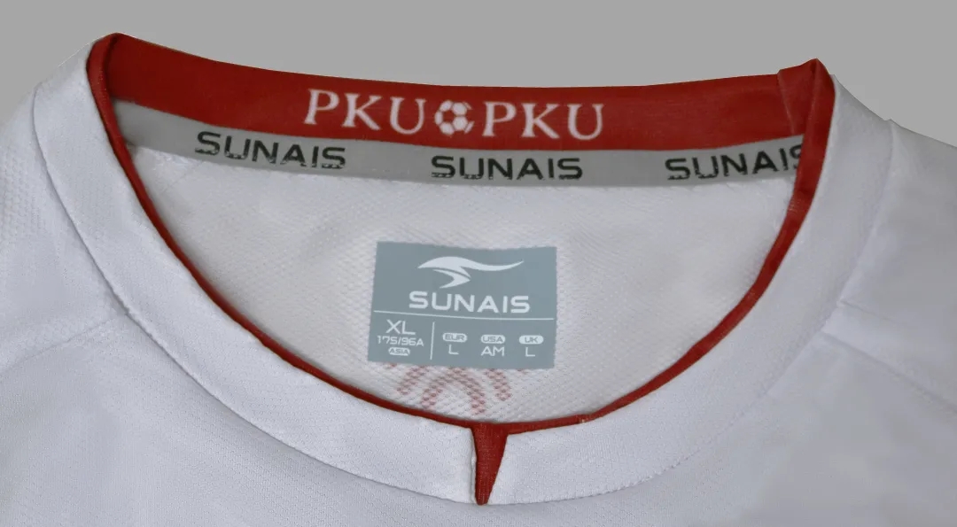 衣領處印有兩個“PKU”字樣,這是北京大學的英文縮寫,中間以足球分隔處理,北大足球隊的含義不言而喻。