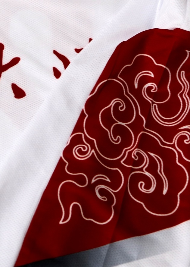 上衣腰側與短褲邊側印有古典云紋圖案,主要取自北大華表,上下呼應,流動飄逸,吉祥高遠。